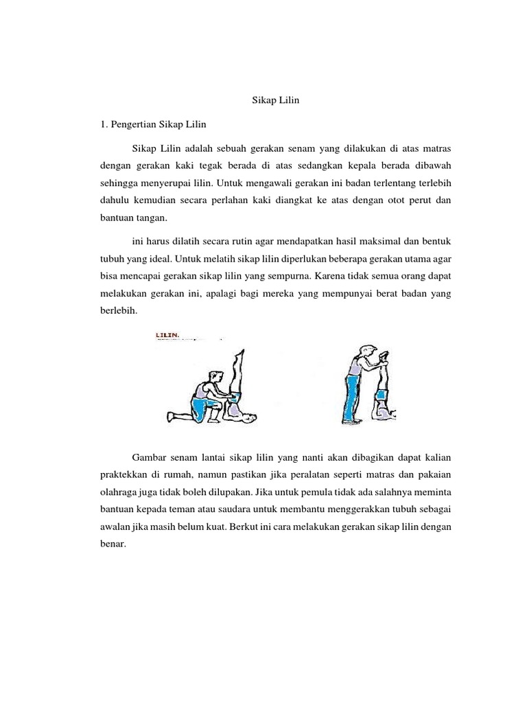 Sikap lilin gambar sikap lilin sikap lilin adalah sikap yang dibuat dari sikap semula tidur telentang kemudian mengangkat kedua kaki rapat lurus ke atas dengan kedua tangan menopang pinggang. Jika untuk pemula tidak ada salahnya meminta bantuan kepada teman atau saudara untuk membantu menggerakkan tubuh sebagai awalan jika masih belum kuat. Senam lantai merupakan salah satu rumpun dari senam.
