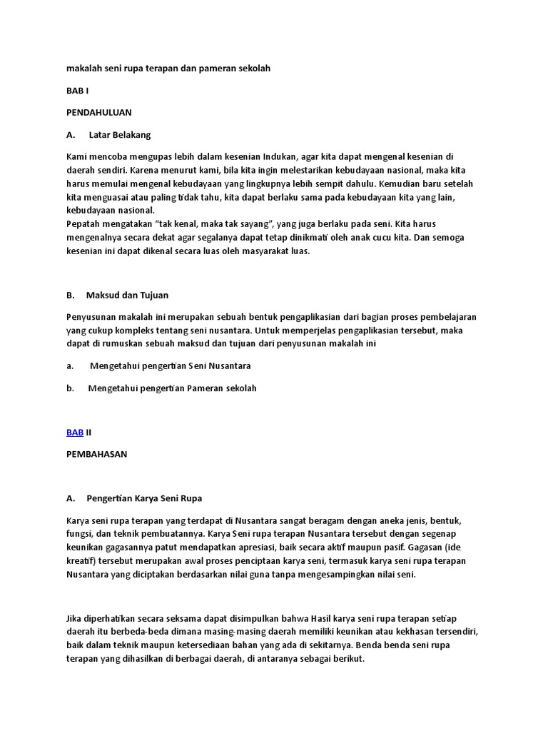 Makalah tentang seni rupa terapan. Namun tidak semua benda itu memiliki nilai guna pakai misalnya lukisan yang hanya berfungsi sebagai hiasan saja. Semoga dapat membantu menambah wawasan anda semikian dan terimah kasih. Disamping itu guru juga perlu menguasai prosedur berkarya seni rupa baik seni rupa terapan maupun seni rupa murni agar bisa membimbing kegiatan berkarya seni rupa.