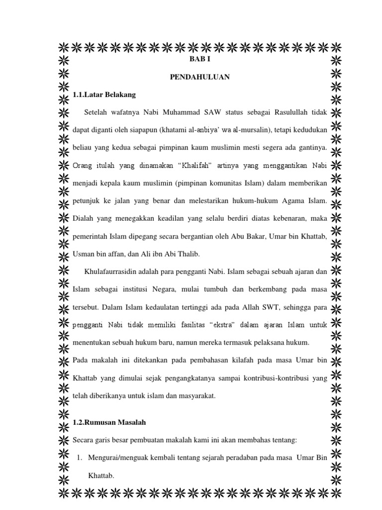Makalah tentang umar bin khattab. Umar bin khatab 583 644 memiliki nama lengkap umar bin khathab bin nufail bin abd al uzza bin ribaah bin abdillah bin qart bin razail bin adi bin ka ab bin lu ay adalah khalifah kedua yang menggantikan abu bakar ash shiddiq. Makalah biografi dan kisah kepemimpinan umar bin khattab ra latar belakang. Salah satu gelar pujian beliau adalah al faruq elang yang diberikan oleh rasulullah saw.
