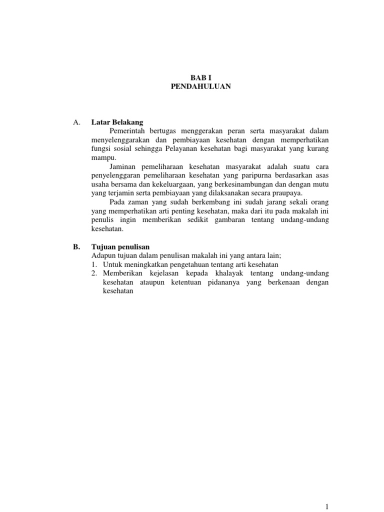 Memberikan kejelasan kepada khalayak tentang undang undang kesehatan ataupun ketentuan pidananya yang berkenaan dengan kesehatan 1 3 metode penulisan metode yang digunakan dalam penyusunan makalah ini yaitu dengan metode pengumpulan data dan membaca dari beberapa sumber semoga apa yang telah disampaikan dapat bermanfaat bagi orang banyak. Pada zaman yang sudah berkembang ini sudah jarang sekali orang yang memperhatikan arti penting kesehatan maka dari itu pada makalah ini penulis ingin memberikan sedikit gambaran tentang undang undang kesehatan. Untuk meningkatkan pengetahuan tentang arti kesehatan 2.
