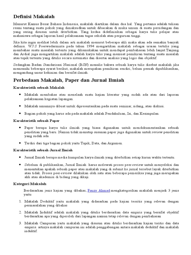 Meskipun umumnya hanya terdiri dari beberapa halaman saja kisaran 6 12 halaman namun paper berisi informasi yang lengkap dan komplit sehingga kerap disamakan dengan makalah karena. Salah satunya adalah judul abstrak pendahuluan metodologi pembahasan kesimpulan dan referensi. Makalah adalah jenis karya tulis yang berisi pemikiran tentang suatu masalah dengan topik tertentu ditulis dengan sistematis serta runtut disertai analisis yang logis dan objektif.