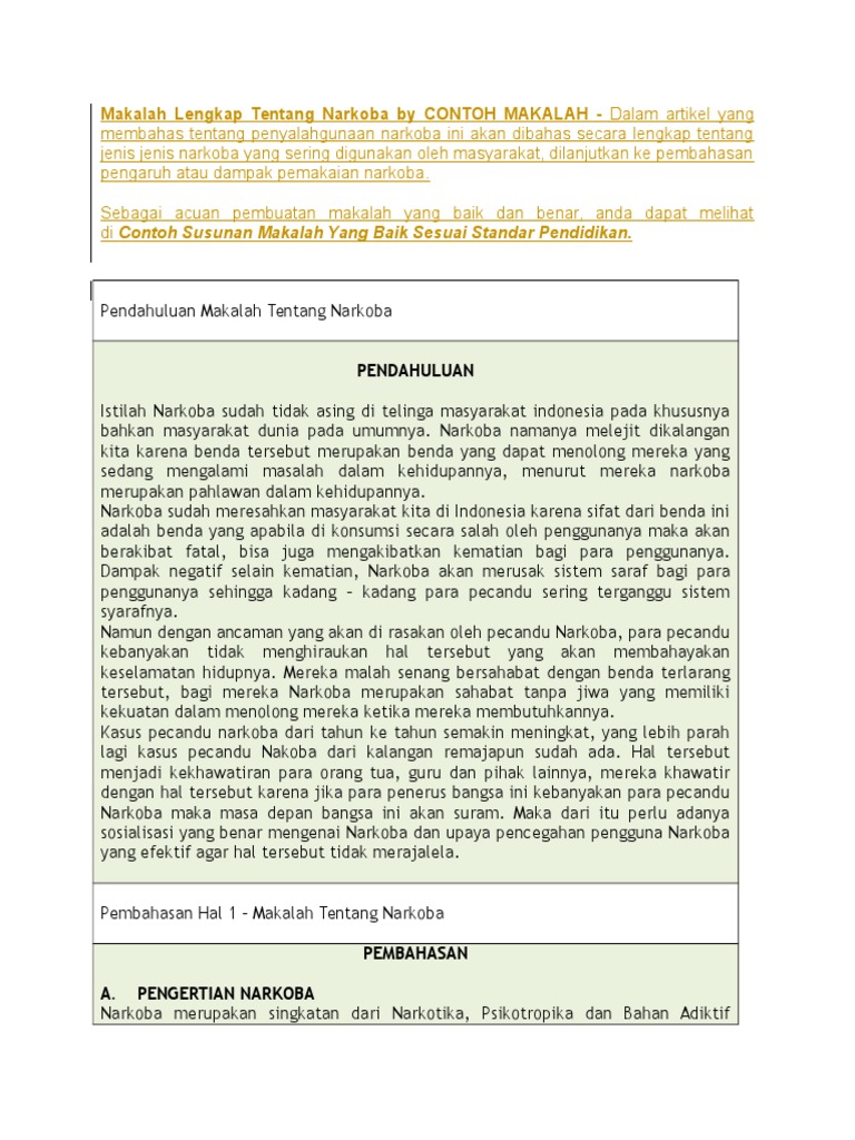 Contoh makalah tentang narkoba semakin maraknya penggunaan obat obatan terlarang dan narkotika mengakibatkan terpengaruhnya mental dan pendidikan bagi pecandunya. Contoh susunan makalah tentang narkoba lengkap dengan pengertian manfaat tujuan sistematika dan cara membuat makalah yang baik dan benar lengkap. Indonesia makalah tentang narkoba 1.